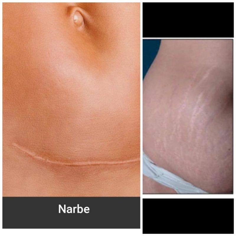 Sehr gute Ergebnisse zeigen sich auch in der Verbesserung von Aknenarben, Operations- narben und Schwangerschaftsstreifen (Dehnungsstreifen).