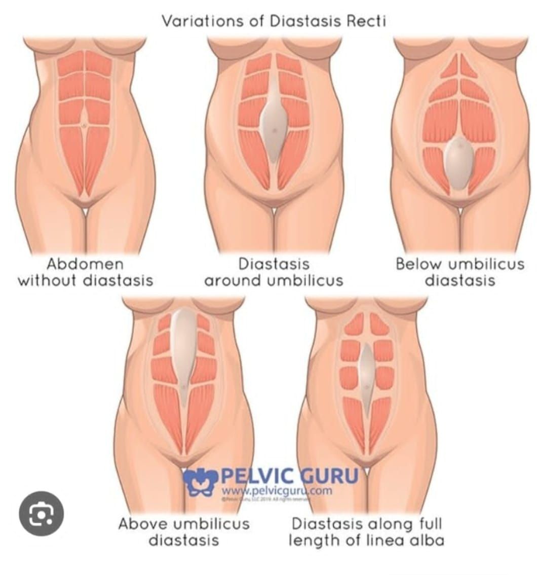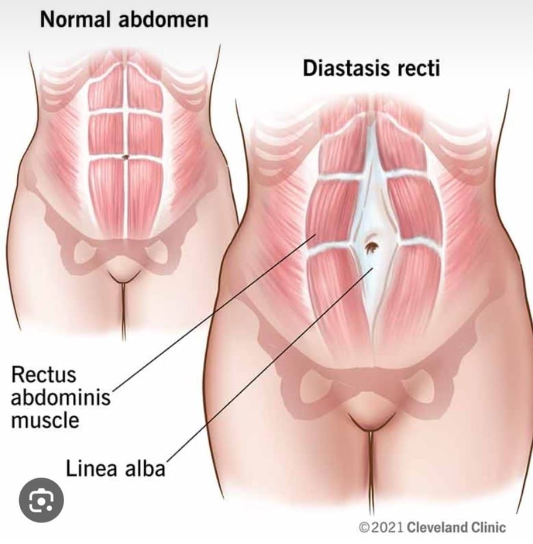 Rektusdiastase bezeichnet die Trennung der geraden Bauchmuskeln. Das zwischen den beiden Muskelbäuchen verlaufende Bindegewebe wird gedehnt und dadurch dünner und schwächer. Derzeit gilt ein Auseinanderweichen der Rectibäuche von mehr als 2 cm aus medizinischer Sicht als pathologischer Befund. Im Idealfall sind die Muskelbäuche etwa 0,6 cm voneinander entfernt und durch die Linea alba in ihrer natürlichen schnurartigen Form miteinander verbunden.[2]